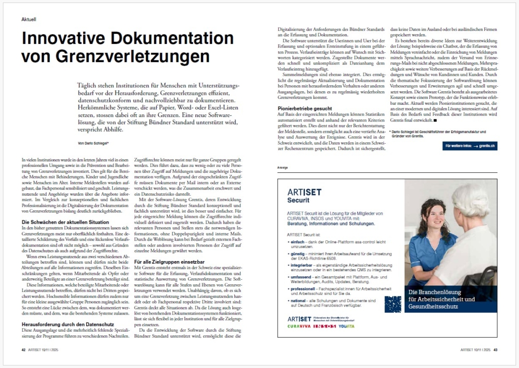 Ich habe mich riesig gefreut, als ich die Zusage erhielt, dass ein Artikel über Grentis im Fachmagazin Artiset (Ausgabe 10-11/2025) publiziert wird.