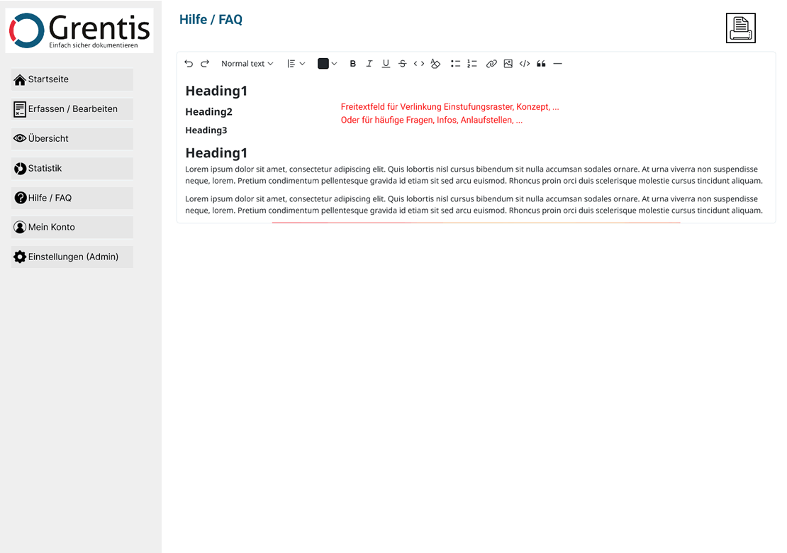 Hier können Sie interne Anweisungen, Verlinkungen, Beschreibungen usw. erfassen und verlinken. Dadurch können Sie Grentis individualisieren und in ihrem Kontext einbetten. So stellen Sie sicher, dass die Nutzerinnen und Nutzer alle wichtigen Informationen zur Dokumentation und Bearbeitung von Grenzverletzungen schnell finden.
