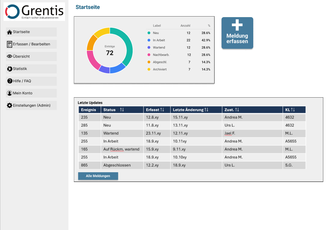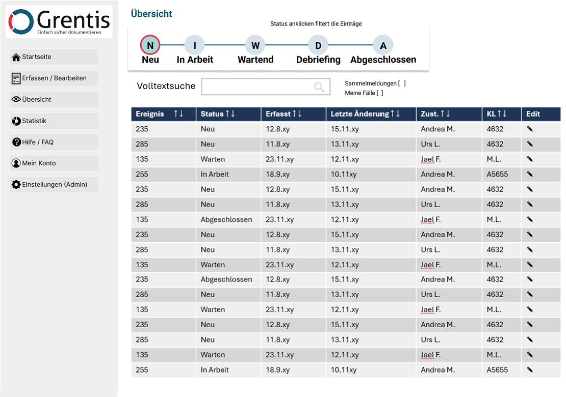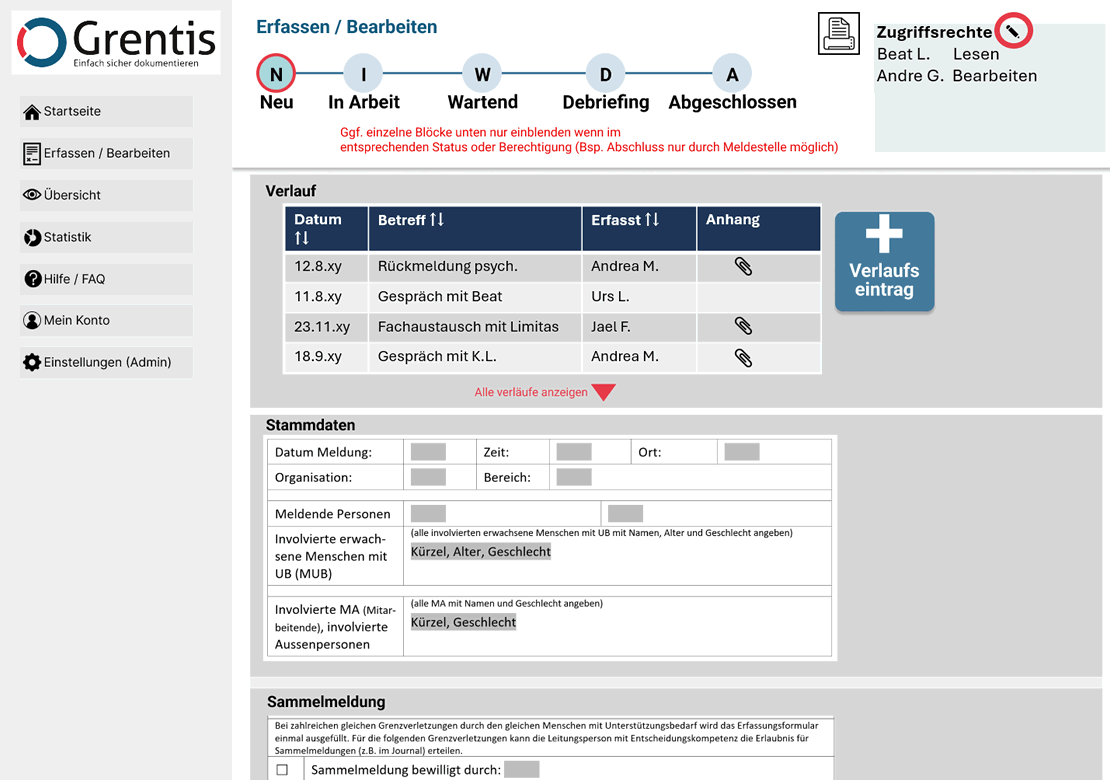 Direkt über dem Erfassungsbogen sind die letzten Verlaufseinträge zum entsprechenden Ereignis ersichtlich. Ebenso ist im oberen Bereich ersichtlich, in welchem Status sich der Ereigniseintrag befindet. Die Erfassung kann schrittweise erfolgen, so können einzelne Angaben auch später hinzugefügt werden, nachdem die Abklärungen zum Ereignis weiter fortgeschritten sind. Einträge können als PDF exportiert werden.